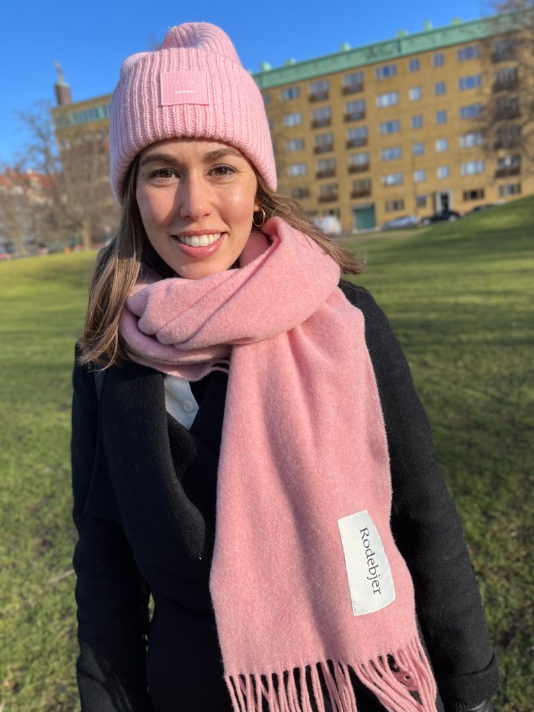 I have a few accessories from this brand, including the longest, coziest mohair checked scarf and the face logo beanie (you’ve seen the black one on the Swedish Netflix show Love & Anarchy). I opted for the bubble gum pink beanie, which is the perfect accessory to combat the Swedish winter darkness.
